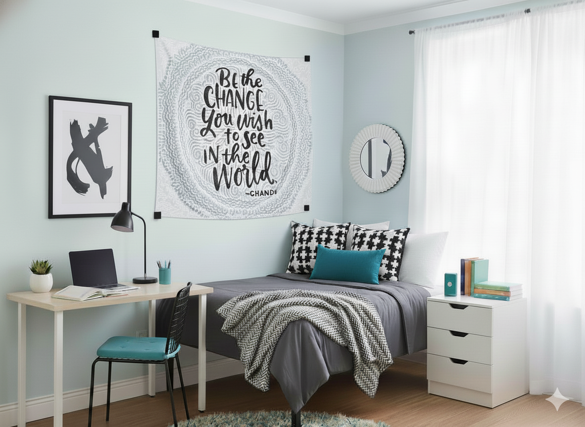 Soft, lightweight microfiber fabric with professionally hemmed edges drapes beautifully on any wall. The design features authentic hand-lettered typography and intricate hand-drawn geometric patterns (no AI here!), creating a calming presence while the empowering message keeps you motivated through late-night study sessions and everything in between. Perfect for your bedroom at home, dorm room, or that first apartment.